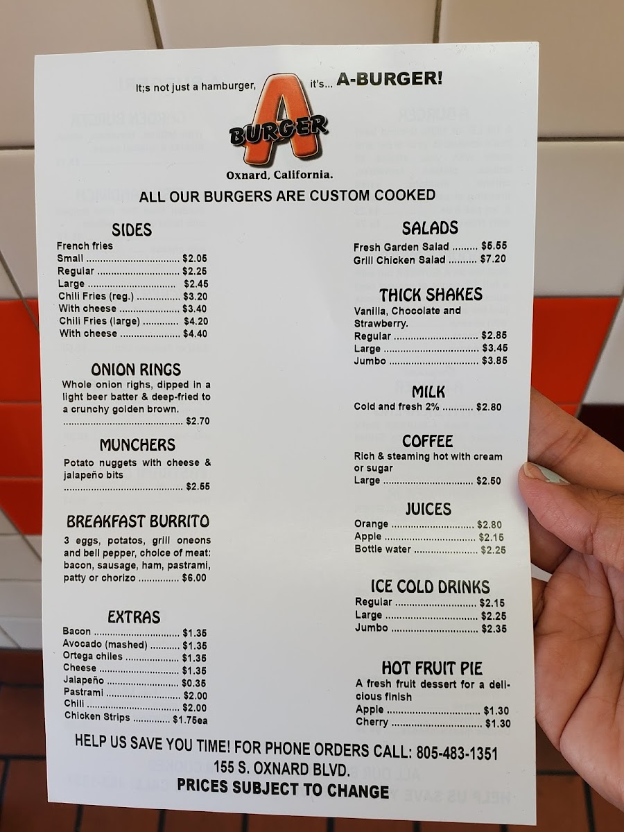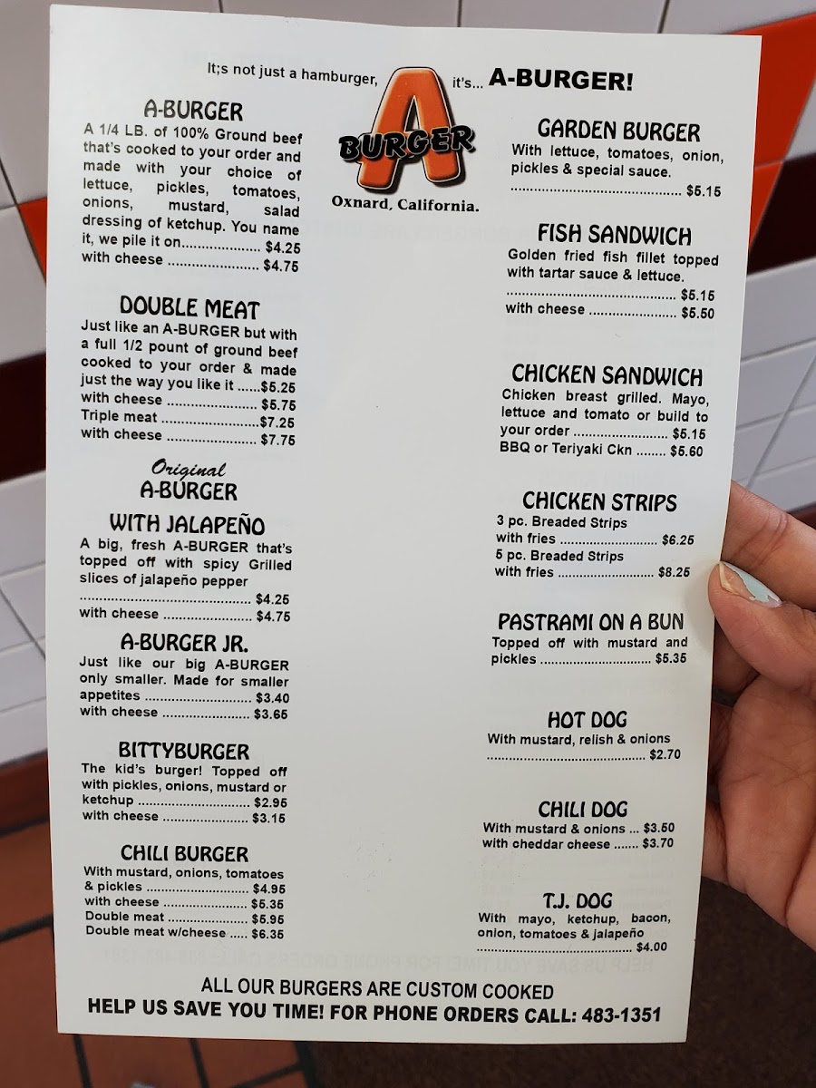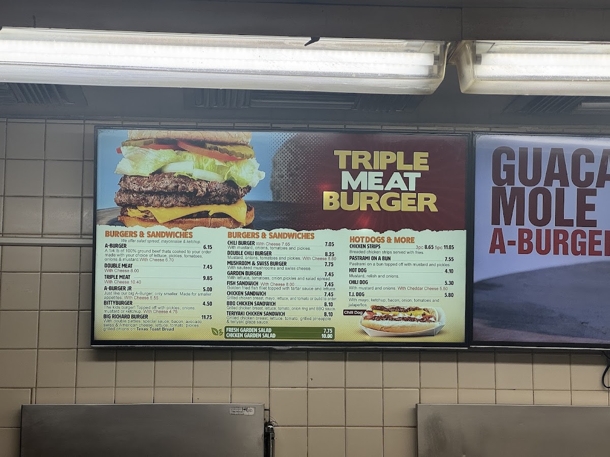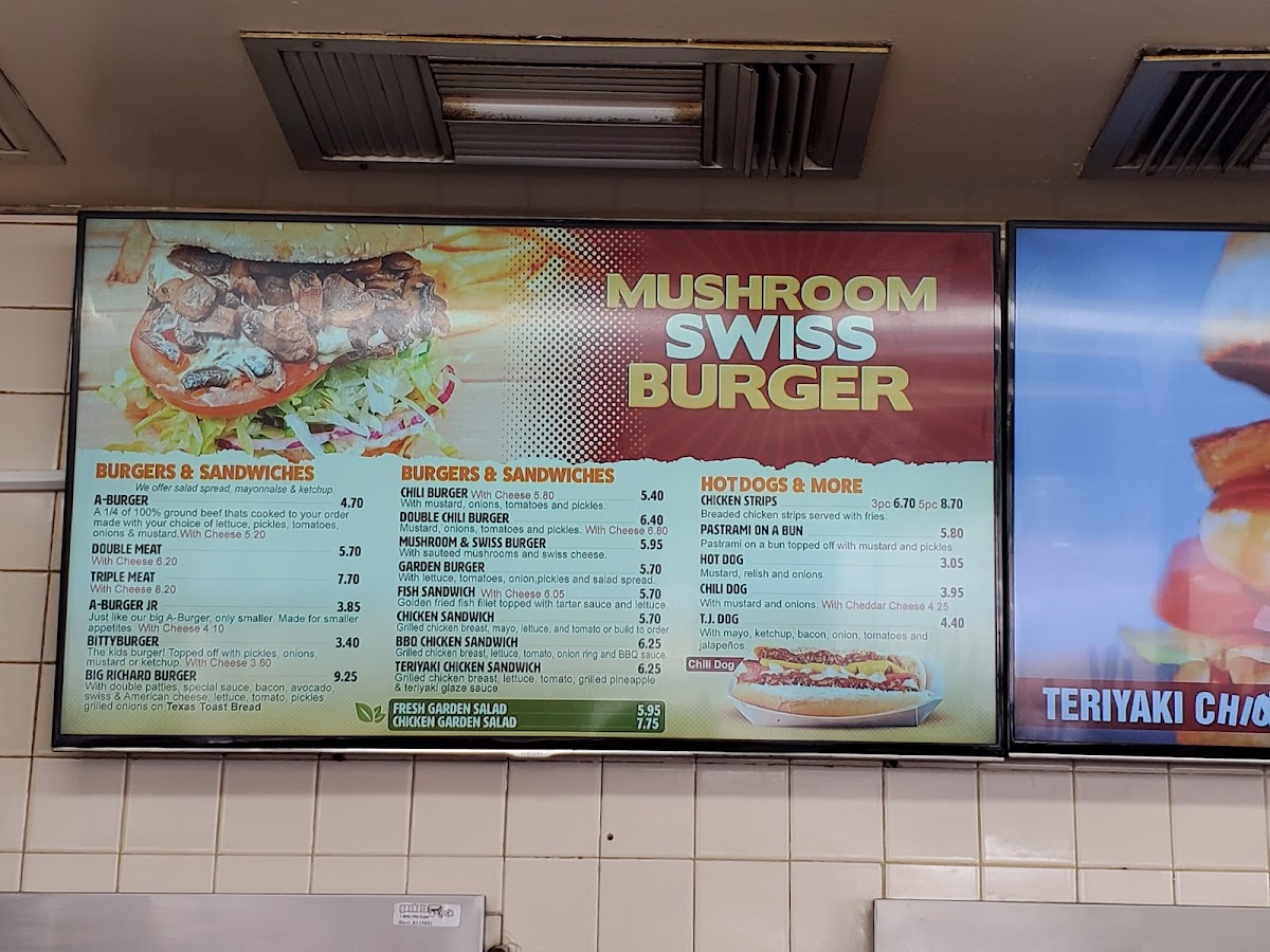 The Burgers and Sandwiches category includes several options based on 100% ground beef patties cooked to order, with choices like the quarter-pound A Burger, its cheeseburger variant, and a kid-friendly Bitty Burger. A grilled chicken sandwich is also available, providing an alternative protein option.