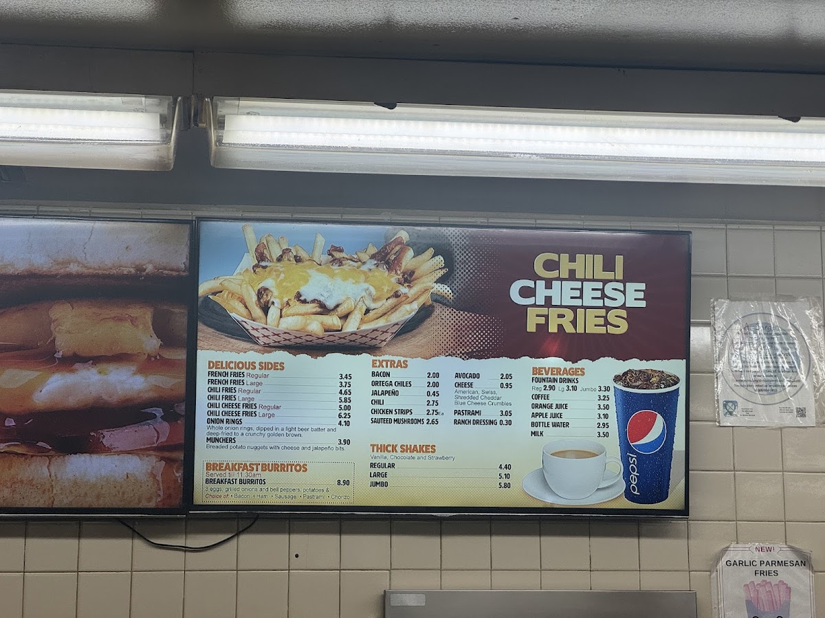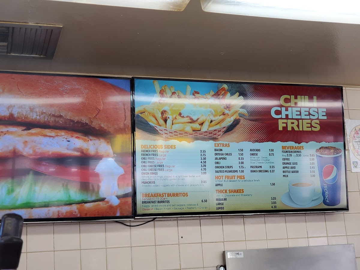 Sides complement the main dishes, featuring regular and large French fries, chili fries, and chili cheese fries. Additional side items include breaded potato nuggets with cheese and jalapeño bits (Munchers) and beer-battered onion rings that are deep-fried to a crunchy texture.