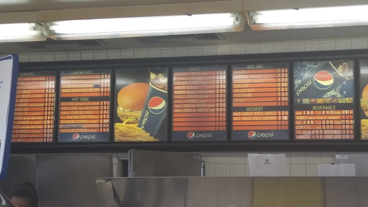 This menu features a variety of classic American fast food options centered around hamburgers and sandwiches. It is organized into distinct sections for ease of selection, including Beverages, Burgers and Sandwiches, and Sides.